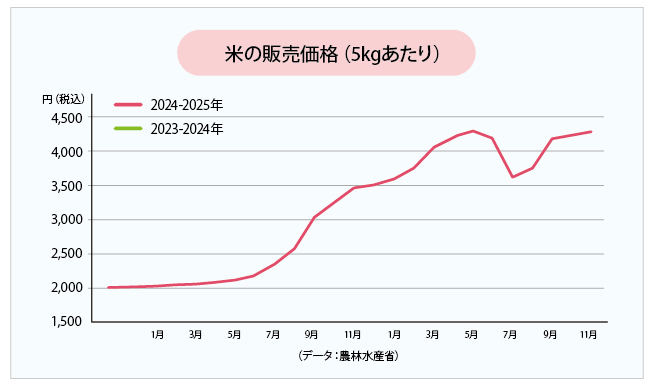 2025年11月に農林水産省が発表した米の平均販売価格は5kgで4,235円と、2024年から始まった価格高騰は現在も継続中です。備蓄米や新米が出始めても元の価格に戻ることはなく、高値がいつ落ち着くのか見通しがつかない状況です。