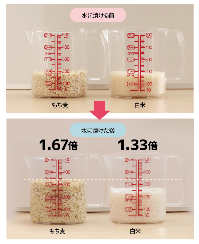 お米は水を吸うと元の1.2~1.3倍の量に膨らみますが、もち麦はお米より水を多く吸うため1.6~1.7倍まで膨らみます。元の量が同じでも、もち麦のほうがより水を吸って量が増えるためさらに経済的です。