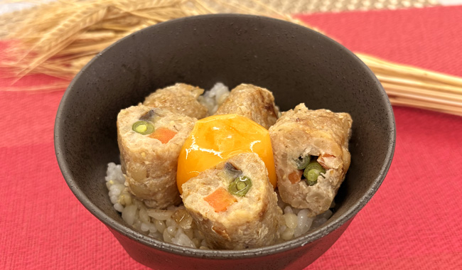 鶏ミンチにもち麦を混ぜ込み、彩り豊かな野菜を加えて仕上げたつくね丼です。たれは調味料の配合にこだわり、卵との相性を意識した味付けになっています。見た目にも華やかで、野菜が苦手な子どもでも食べやすいように工夫されています。