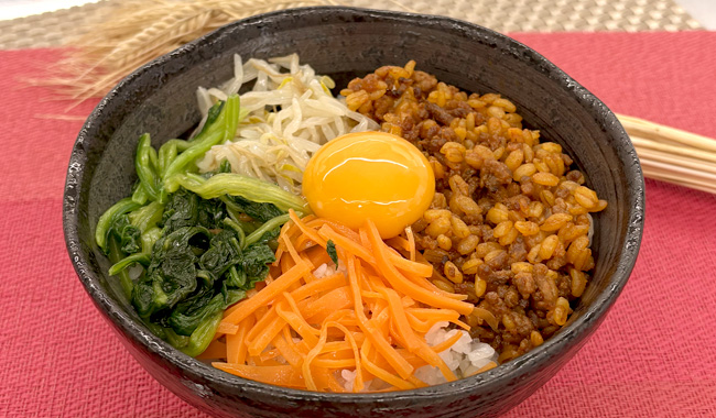 肉そぼろにもち麦を甘辛く仕上げたことで、野菜はあえてシンプルな味付けし、全体の味のバランスを整えています。卵を割りいれて混ぜて食べることで、野菜やもち麦などの様々な食感を味わえる一品です。