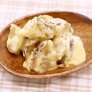 ひとくちサイズのさつまいもの皮を取り、ボウルに入れてつぶす。