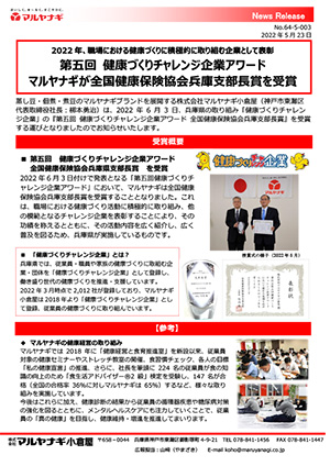 蒸し豆・佃煮・煮豆のマルヤナギブランドを展開する株式会社マルヤナギ小倉屋(神戸市東灘区 代表取締役社長:柳本勇治)は、2022 年 6 月 3 日、兵庫県の取り組み「健康づくりチャレンジ企業」の『第五回 健康づくりチャレンジ企業アワード 全国健康保険協会兵庫支部長賞』を受賞する運びとなりましたのでお知らせいたします。