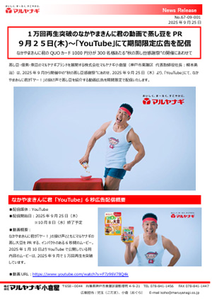 蒸し豆・佃煮・煮豆のマルヤナギブランドを展開する株式会社マルヤナギ小倉屋(神戸市東灘区 代表取締役社長:柳本勇治)は、2025年9月から開催中の“秋の蒸し豆感謝祭”にあわせ、2025年9月25日(木)より、「YouTube」にて、なかやまきんに君が「ヤー!」の掛け声で蒸し豆を紹介する動画広告を期間限定で配信いたします。