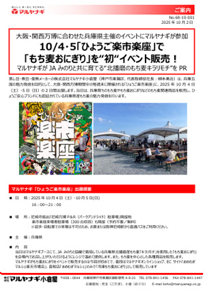 蒸し豆・煮豆・佃煮メーカーの株式会社マルヤナギ小倉屋(神戸市東灘区、代表取締役社長:柳本勇治)は、兵庫五国の魅力発信を目的として、大阪・関西万博期間中の毎週末に開催される「ひょうご楽市楽座」に、2025年10月4日(土)・5日(日)の2日間出展します。当日は、兵庫育ちのもち麦やもち麦おにぎりなどのもち麦関連商品を販売し、ひょうご安心ブランドにも認証されている兵庫県産もち麦の魅力発信を行います。
