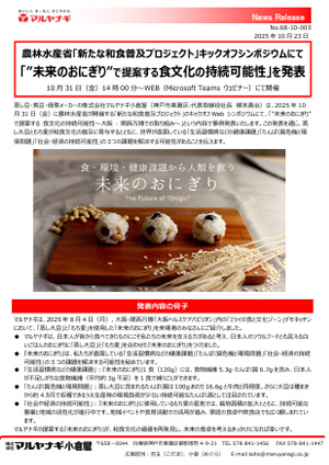 蒸し豆・煮豆・佃煮メーカーの株式会社マルヤナギ小倉屋(神戸市東灘区:代表取締役社長 柳本勇治)は、2025年10月31日(金)に農林水産省が開催する「新たな和食普及プロジェクト」のキックオフWeb シンポジウムにて、「”未来のおにぎり”で提案する 食文化の持続可能性~大阪 · 関西万博での取り組み~」という内容で事例発表いたします。この発表を通じ、蒸し大豆ともち麦が和食文化の普及に寄与するとともに、世界が直面している「生活習慣病などの健康課題」「たんぱく質危機と環境問題」「社会・経済の持続可能性」の3つの課題を解決する可能性があることを伝えます。