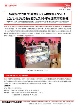 蒸し豆・煮豆・佃煮メーカーの株式会社マルヤナギ小倉屋(神戸市東灘区:代表取締役社長 柳本勇治)が、兵庫県加東市(市長:岩根正)、JA みのり(加東市:代表理事組合長 竹内千博)、兵庫県北播磨県民局(加東市:局長 成田徹一)、および加東市内のもち麦生産者と組織する「加東市もち麦活用協議会」は、協働で栽培しているもち麦の魅力を広め、農業振興、地域活性化に繋げたいとの想いから、2025年12月14日(日)にやしろショッピングパークBioにて、特産品もち麦を使用した体験型イベント「かとうもち麦フェス」を開催します。