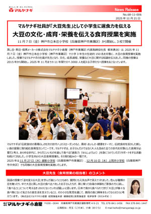 蒸し豆・煮豆・佃煮メーカーの株式会社マルヤナギ小倉屋(神戸市東灘区:代表取締役社長 柳本勇治)は、2025年11月7日(金)神戸市立本庄小学校(神戸市東灘区)で小学3年生の生徒約150名を対象に、大豆の食育授業を実施しました。授業ではマルヤナギの社員が先生となり、文化、成長過程、栄養など大豆に関する知識を伝えました。同様の授業は2015年から開始し、2025年11月までの11年間でのべ3000人を超える子供たちへ授業をおこなっています。