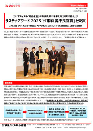 蒸し豆・煮豆・佃煮メーカーである株式会社マルヤナギ小倉屋のグループ会社、株式会社だいずデイズ(神戸市東灘区:代表取締役社長 柳本勇治)が「有機農業拡大のための転換期間中大豆の活用」をテーマに作成した動画作品が、農林水産省・消費者庁・環境省が連携する「あふの環(わ)2030プロジェクト」のサステナアワード2025において、「消費者庁長官賞」を受賞しました。