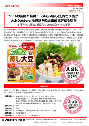 蒸し豆・煮豆・佃煮メーカーの株式会社マルヤナギ小倉屋(神戸市東灘区:代表取締役社長 柳本勇治)は、「おいしい蒸し豆」シリーズ3品、「大容量蒸し豆」シリーズ2品、「おいしいもち麦シリーズ」3品、「マルヤナギwith日本の農家さん」シリーズ1品(計9品)で、エムスリー株式会社(東京都港区:代表取締役 谷村格)が提供する「AskDoctors評価サービス」による評価の結果、100名中99%の医師の推奨意向を得て 「AskDoctors医師の確認済み商品」マークを取得しました。推奨意向99%マーク付きのパッケージは2026年3月下旬より順次、全国の小売店およびスーパーマーケットなどで販売いたします。
