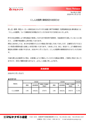 蒸し豆・佃煮・煮豆メーカーの株式会社マルヤナギ小倉屋(神戸市東灘区 代表取締役社長:柳本勇治)は、「にしん甘露煮」ついて価格改定を実施させていただきますのでお知らせいたします。